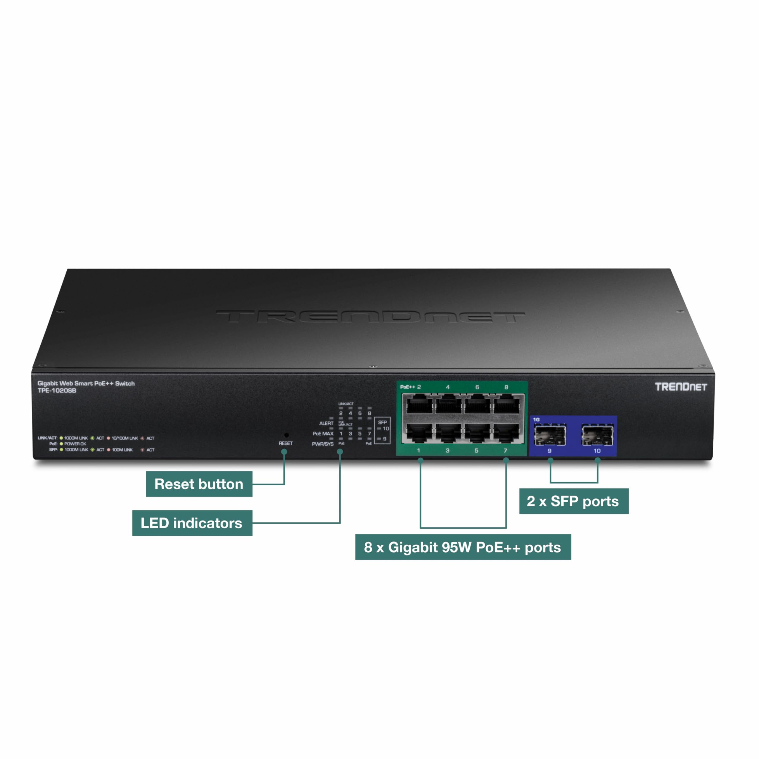 TRENDnet 10-Port Gigabit Web Smart PoE++ Switch, TPE-1020SB, 8 x Gigabit 95W PoE++ Ports, 2 Gigabit SFP Ports, 180W PoE Power Budget, Lifetime Protection, Black