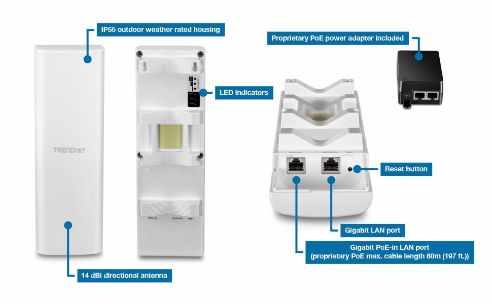 - DEVICE INTERFACE: 1 x Gigabit PoE-in LAN port (proprietary PoE max. cable length 60m (197 ft.)); 1 x Gigabit LAN port; LED indicators; Reset button