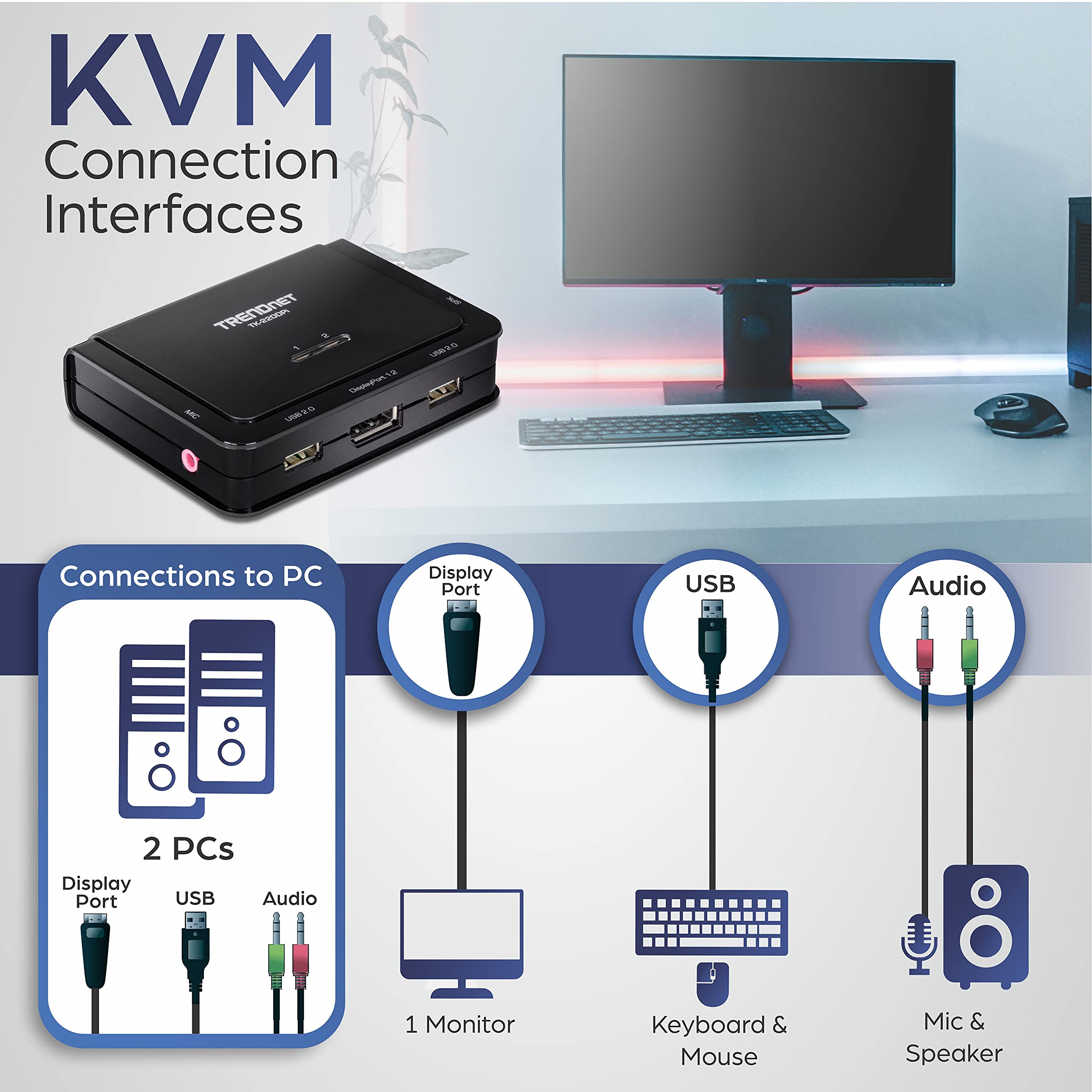 TRENDnet 2-Port 4K DisplayPort 1.2 KVM Switch with Audio, 4K UHD (3840 x 2160@60Hz), 3.5mm Speaker/Microphone, USB 2.0, Integrated Cables, Black, TK-220DPI