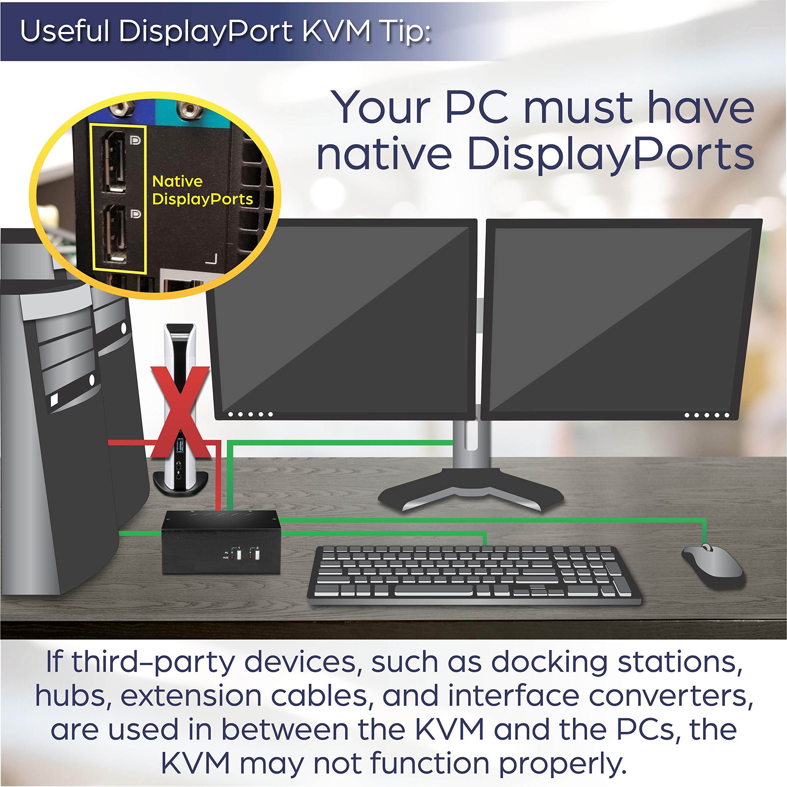 - CONTROL TWO COMPUTERS: This 2-port Dual monitor DisplayPort KVM 1. 2 KVM switch allows you to control two computers with one set of console controls and is designed for use with Dual DisplayPort systems. The KVM switch is designed to connect two DisplayPort monitors. [Recommended for use with DisplayPort monitors and graphic cards with DisplayPort]