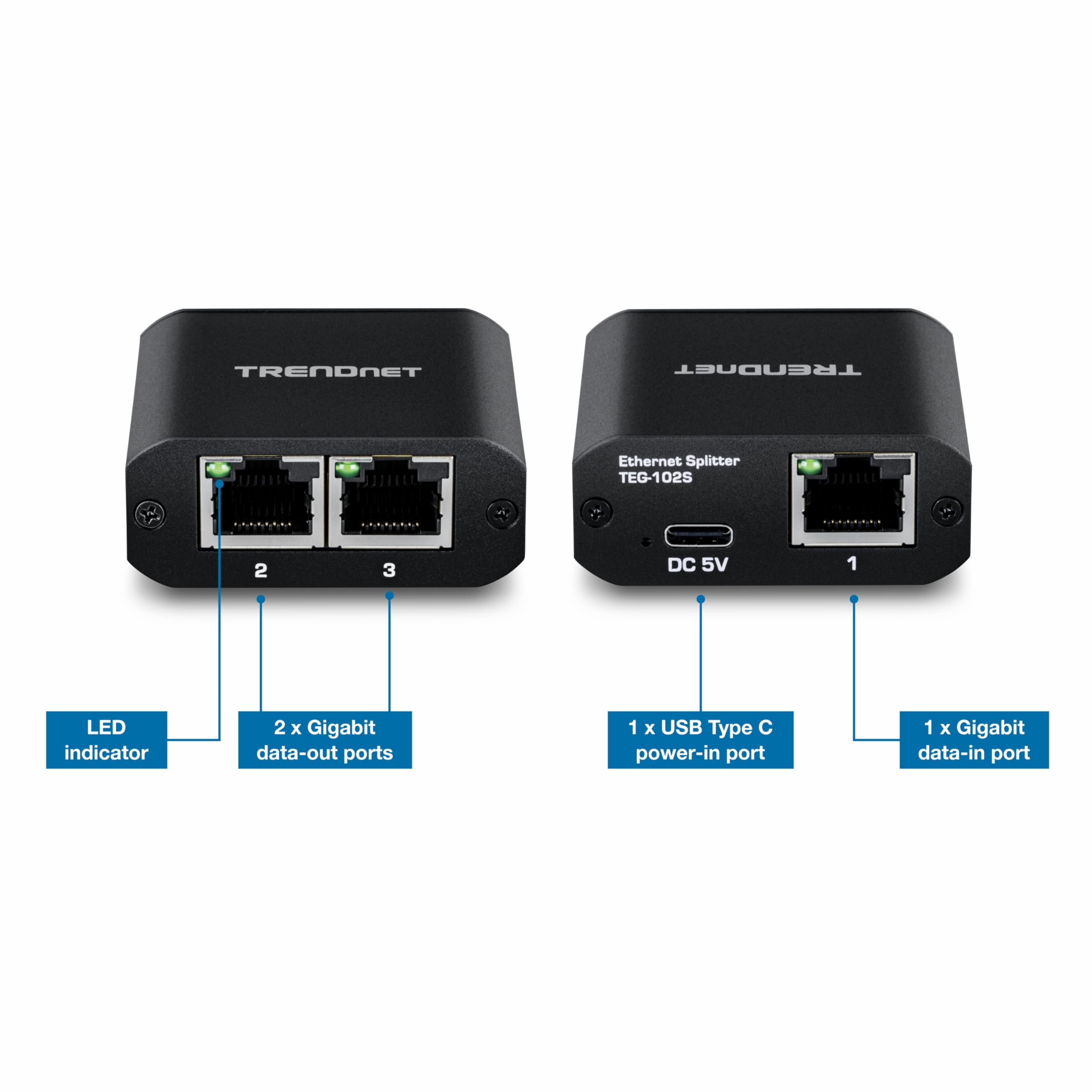 TRENDnet 2-Port Gigabit Splitter with USB Type C Power, TEG-102S, Splits One Network Connection Into Two, Ethernet Splitter, USB Type C Power Cable Included, NDAA & TAA Compliant