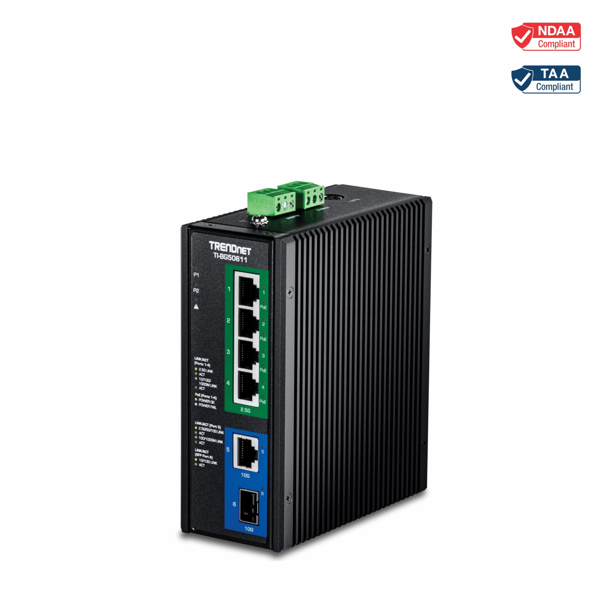 TRENDnet 6-Port Industrial 2.5G PoE++ DIN-Rail Switch with 10G Ports,TI-BG50611,Multi-Gigabit,4 x 2.G PoE++ Ports, 1 x 10G RJ-45 Port,1 x 10G SFP+ Port,Lifetime Protection, Black