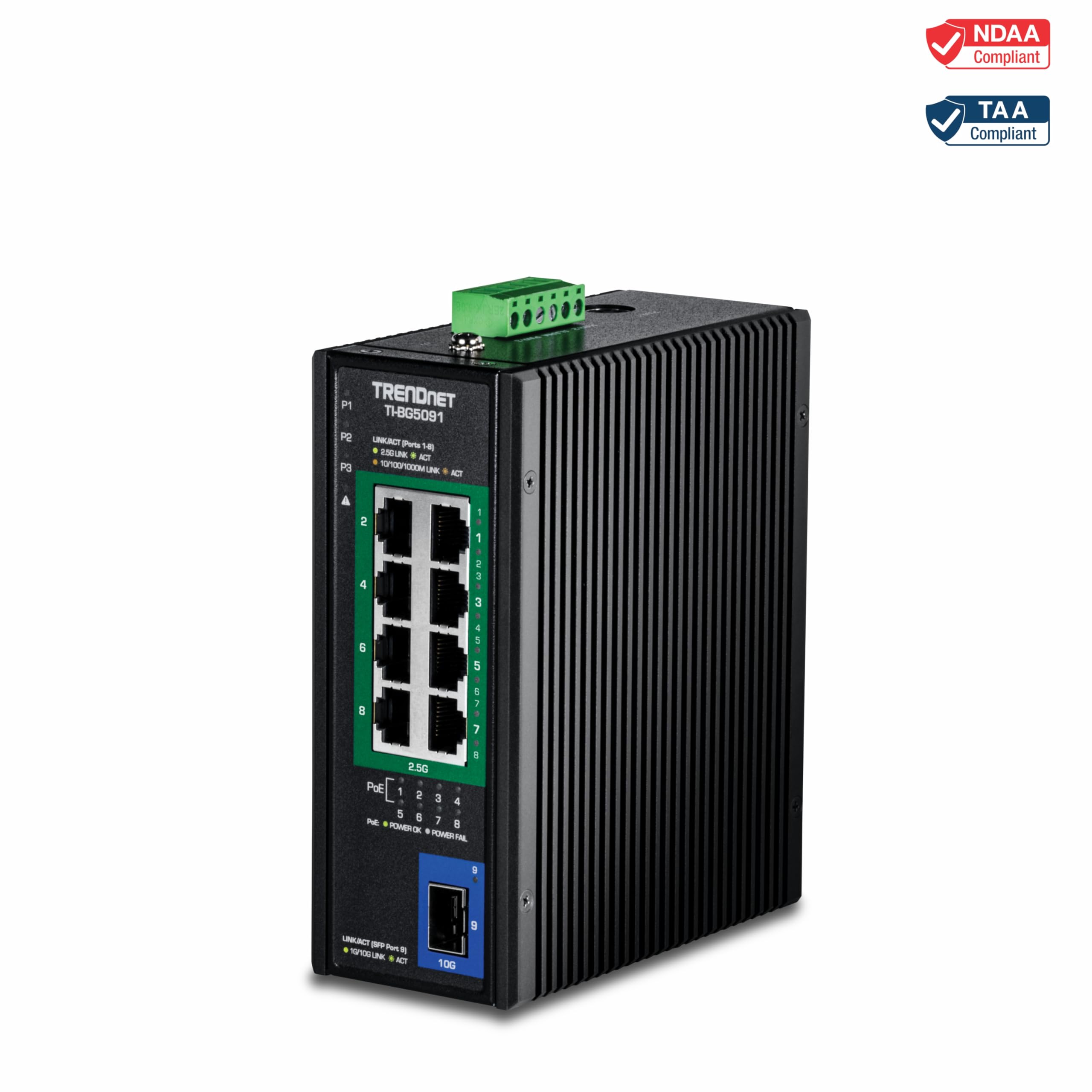 TRENDnet 9-Port Industrial 2.5G DIN-Rail PoE++ Switch with 10G SFP+ Port, TI-BG5091, Multi-Gigabit, 8 x 2.G PoE++ Ports, 1 x 10G SFP+ Port, 480W PoE Power Budget, 60Gbps, Lifetime Protection, Black