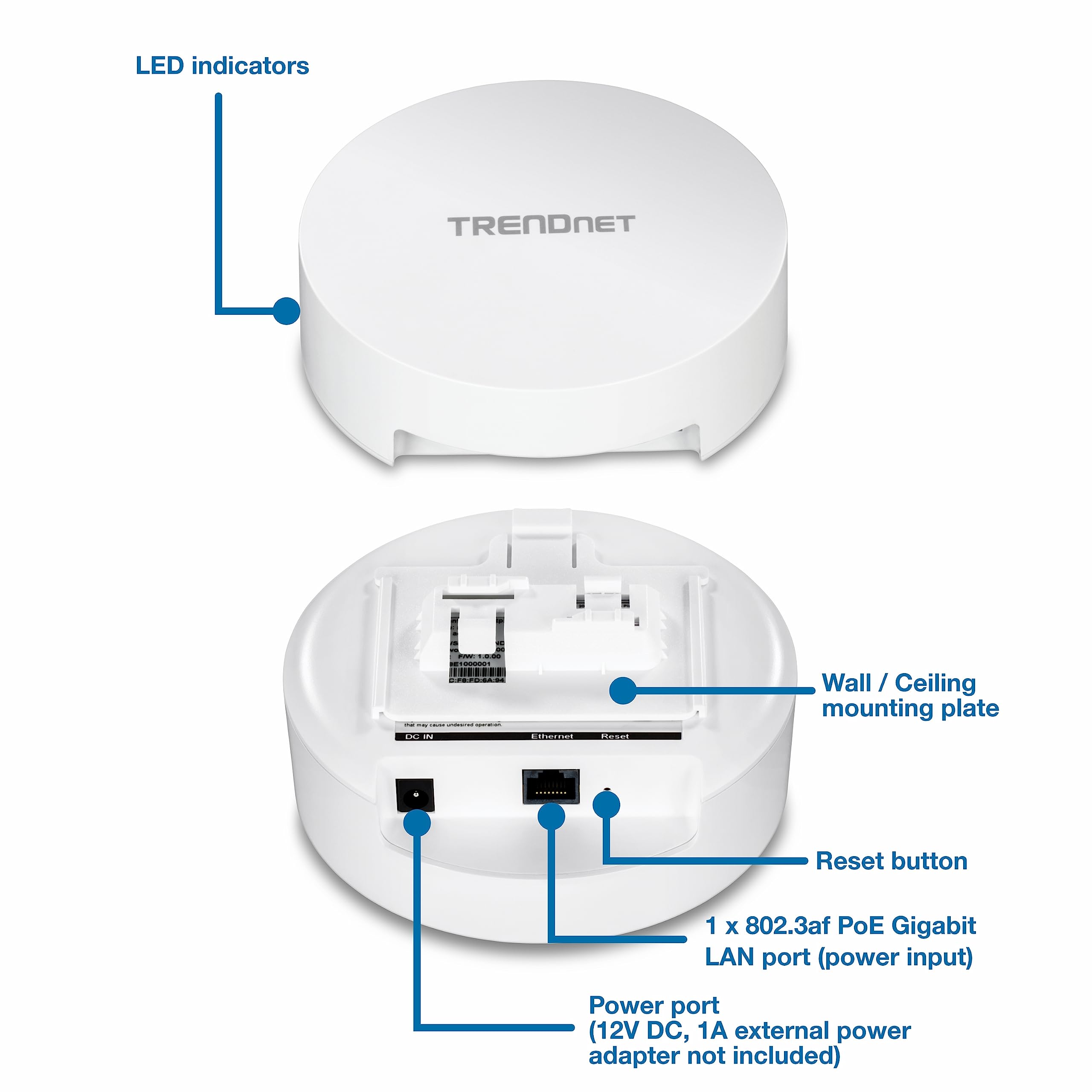 - DEVICE INTERFACE: 1 x 802.3af PoE Gigabit LAN port (power input); Power port (12V DC, 1A external power adapter not included); LED indicator; Reset button; Network cable (1m/3.28 ft.); Mounting plates