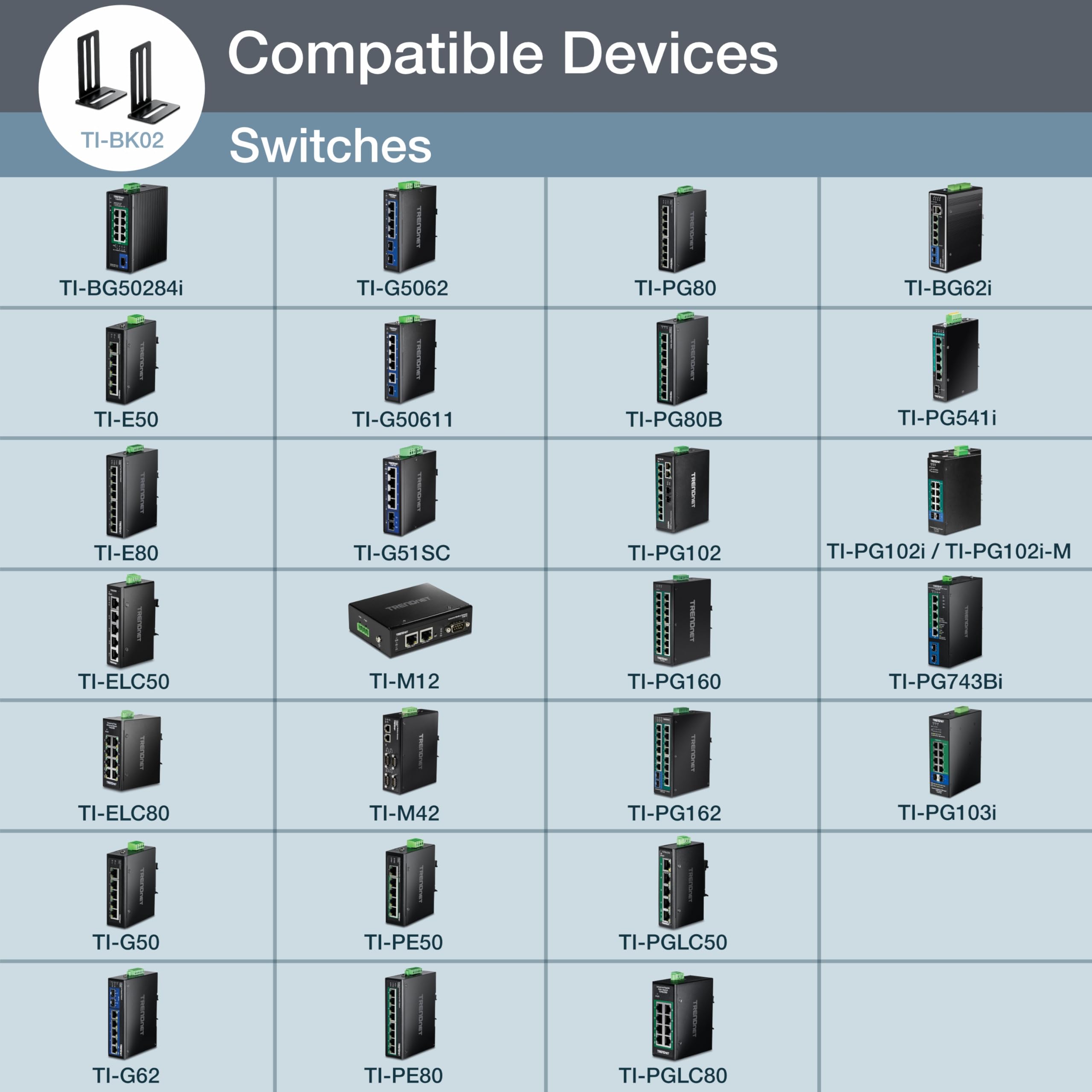 - Compatible with the following TRENDnet Switches: TI-B541,TI-BG104,TI-BG108, TI-BG50611, TI-BG5091, TI-BG5091B, TI BG50284i, TI-E50, TI-E80, TI-ELC50, TI-ELC80, TI-G50, TI-G62, TI-G80, TI-G102, TI-G162