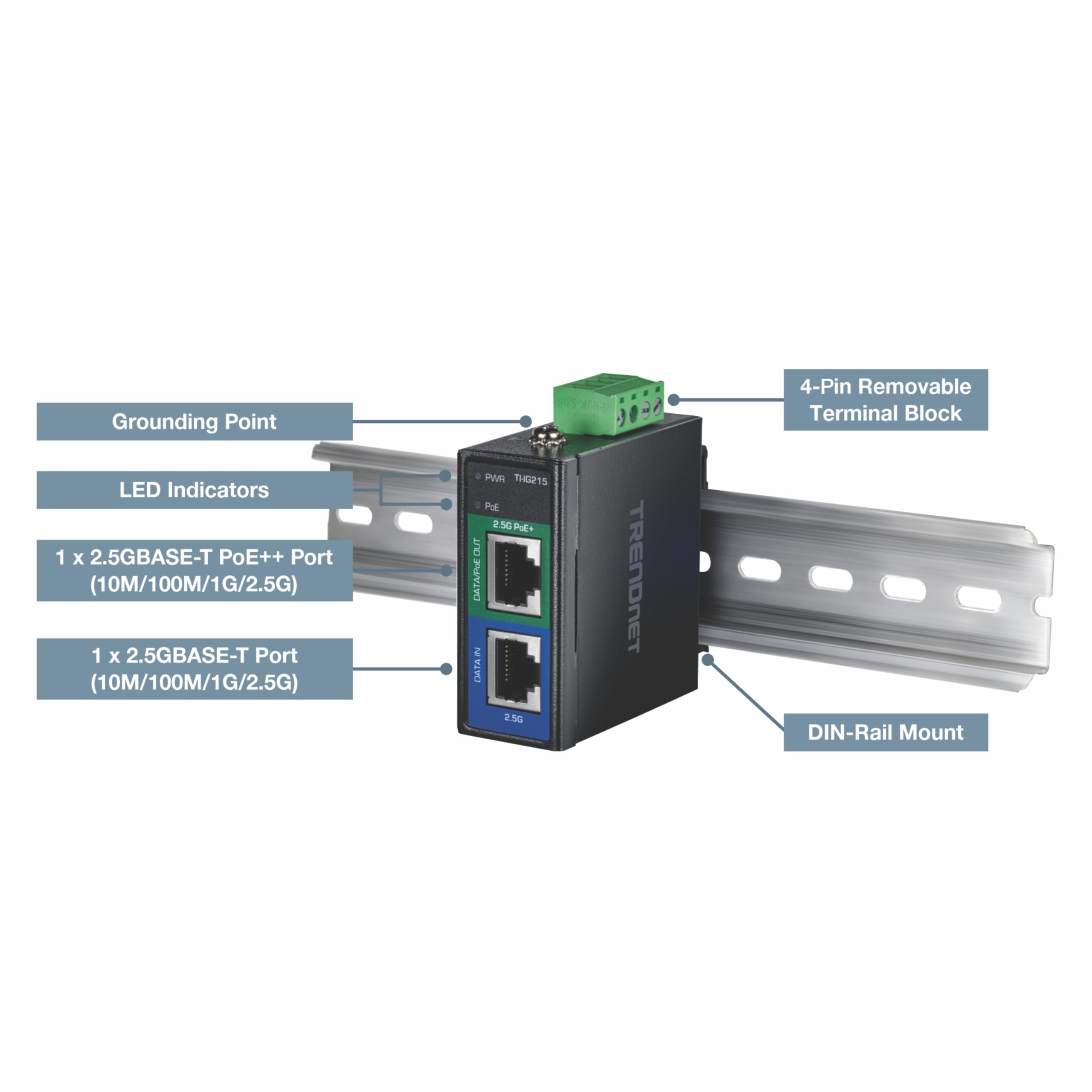 TRENDnet Industrial 2.5G PoE++ Injector, TI-IG219, Extreme Temperature Ready, IP50, NDAA & TAA Compliant, Up to 100m (328 ft), Supports (15.4W), (30W), and (95W) Devices, NDAA TAA Compliant