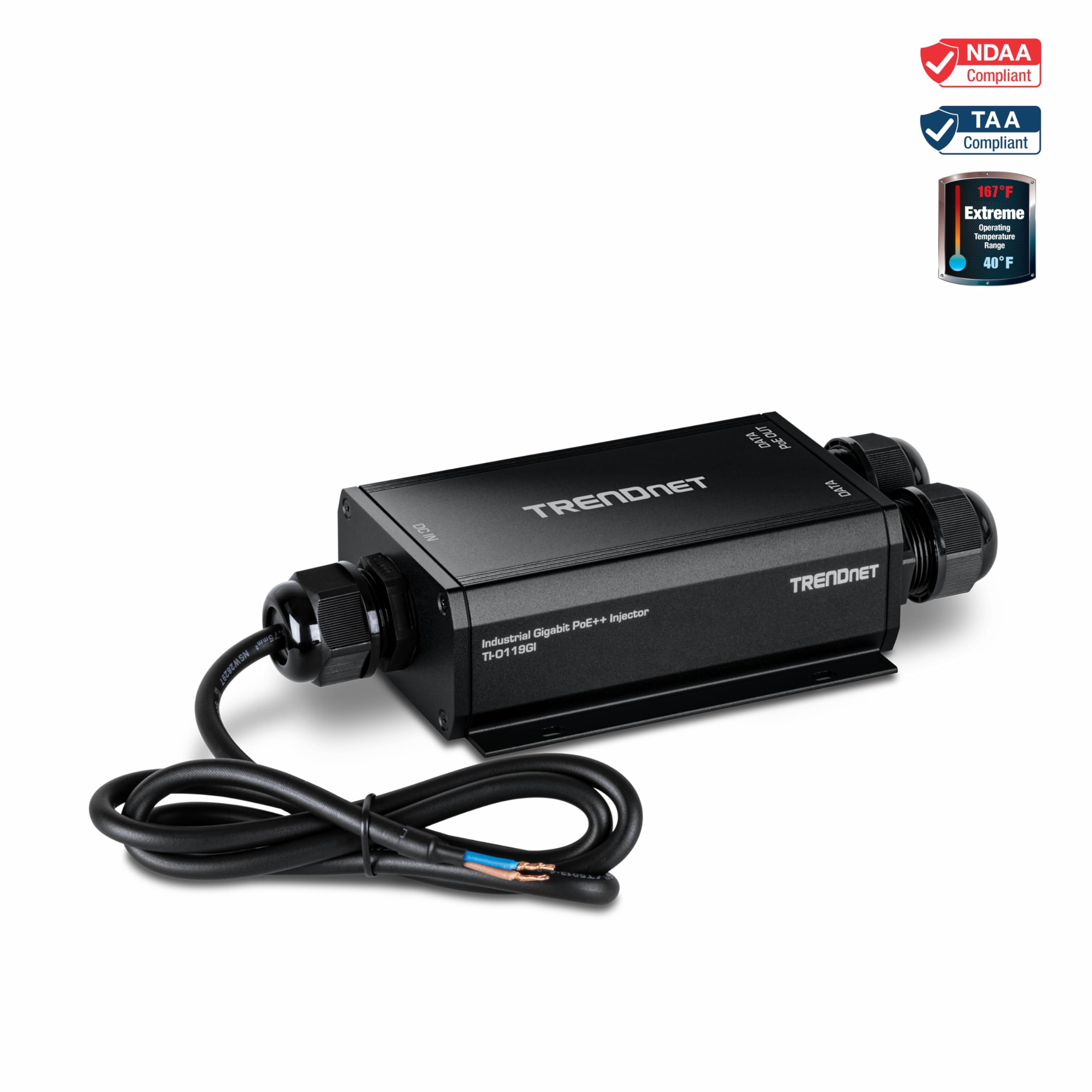 TRENDnet Outdoor IP67 Gigabit PoE++ Injector, TI-O119GI, Supports 24–57V DC Power Input, 96W PoE Power Budget, IP67 Rated Housing, Support PoE (15.4W), PoE+ (30W), PoE++ (95W)